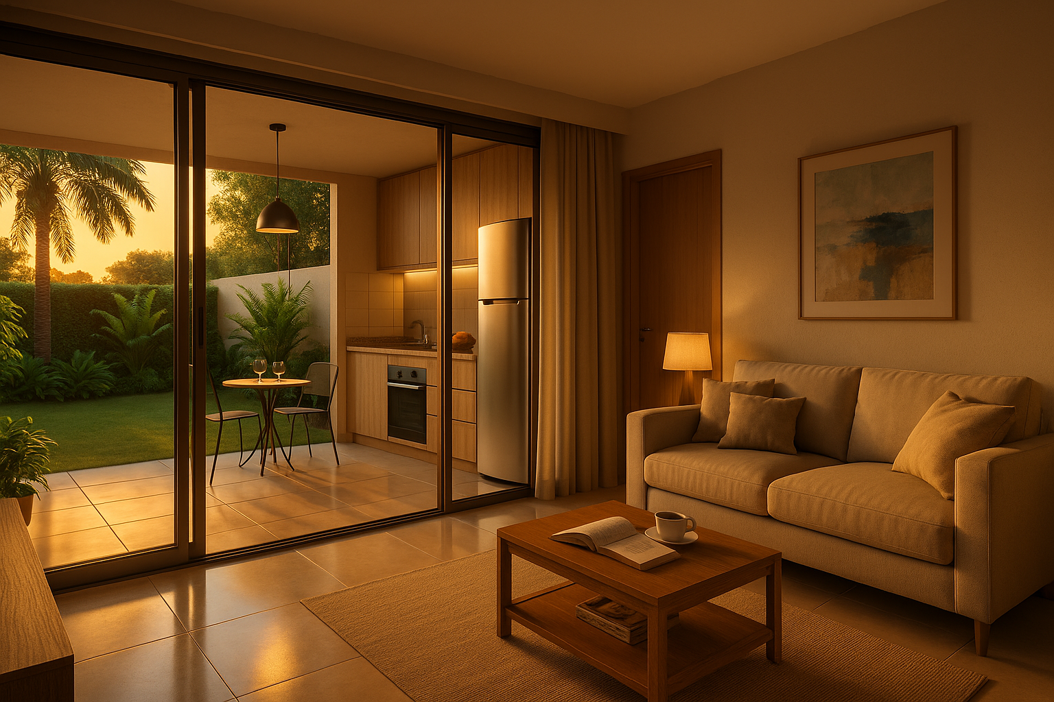 Diferenciais: Garden com vista lateral para a piscina e incidência de sol da tarde, criando uma atmosfera quente, acolhedora e ideal para fins de tarde com amigos.