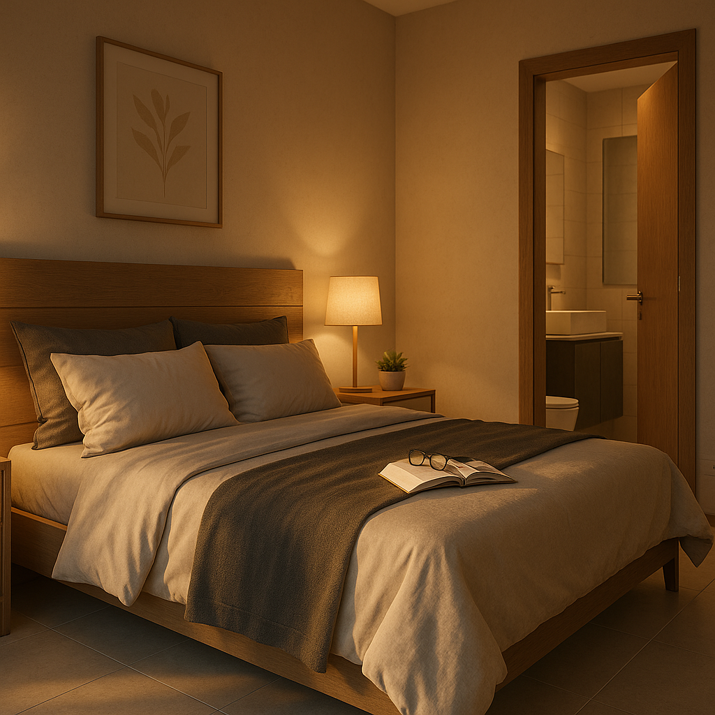 Inspirado nas tonalidades do oceano e na luz dourada do pôr do sol, combina elementos em madeira, branco e azul profundo, transmitindo tranquilidade e elegância.